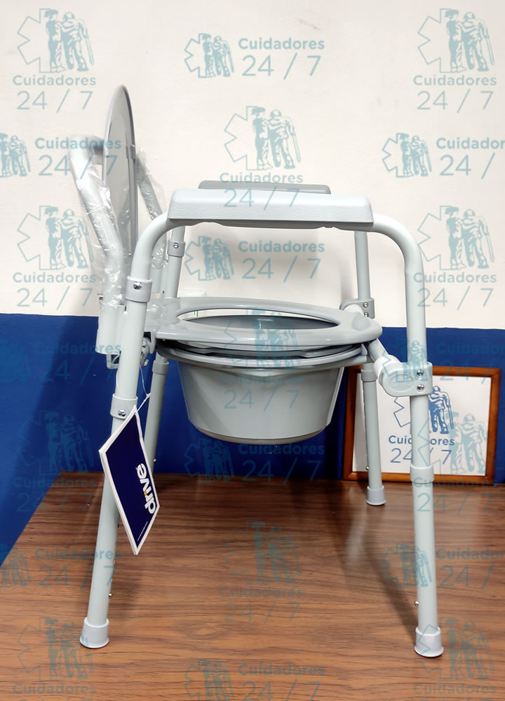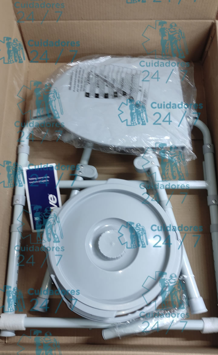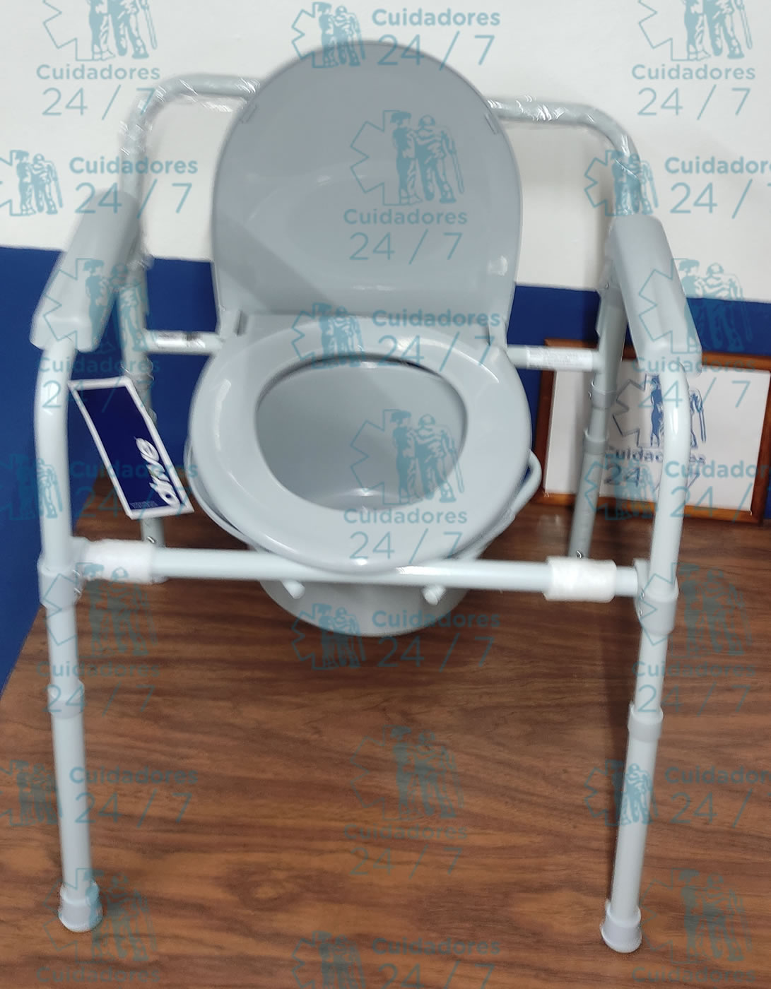 Tapa plástica abatible y desmontable, respaldo desmontable, marco para soportar la cubeta, 7 niveles para ajustar la altura, estructura de acero esmaltado, descansabrazos fijos y texturizados, asiento de 13" desmontable, seguros de botón, cubeta plástica desmontable con tapa, 4 regatones antiderrapantes.